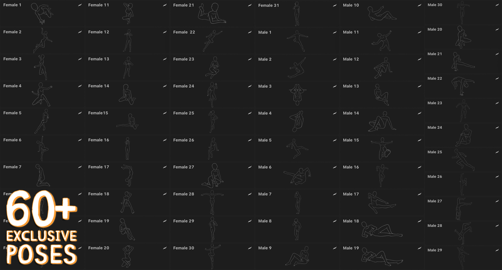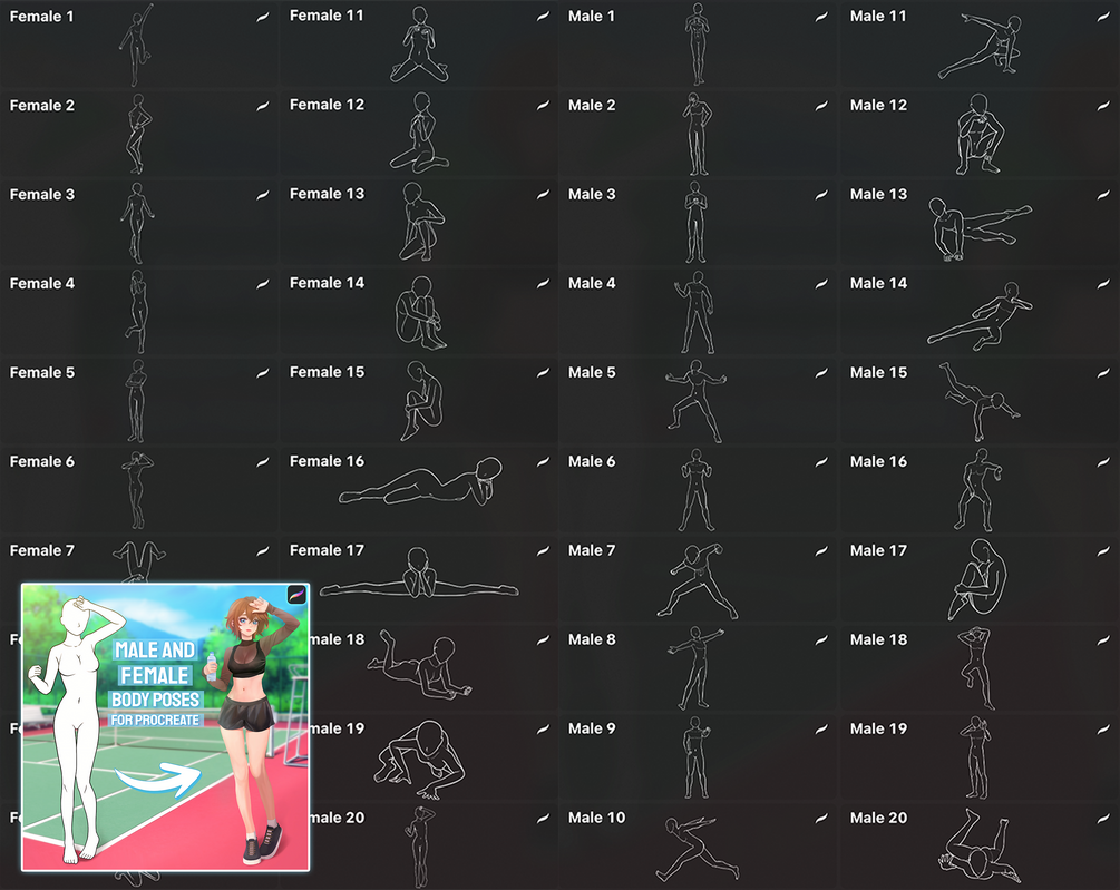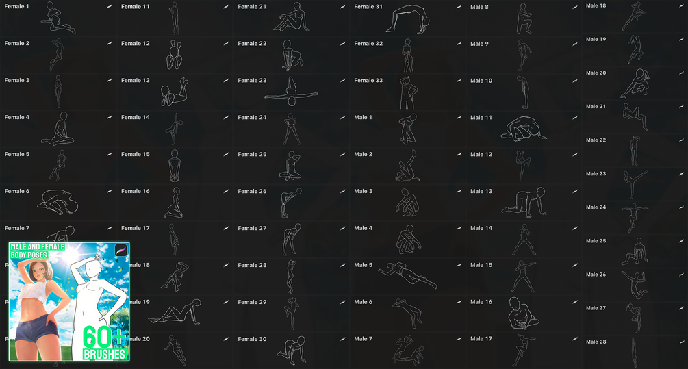 Give your character a unique pose with this set of 300 brushes! I've collected all the pose sets from my store, as well as created 60 unique poses exclusively for this pack. These brushes are perfect for manga, comics, tattoos, and more. The pack includes an equal number of male and female poses, you'll love them!