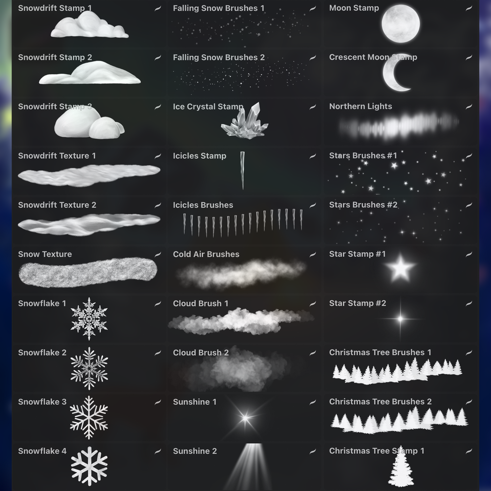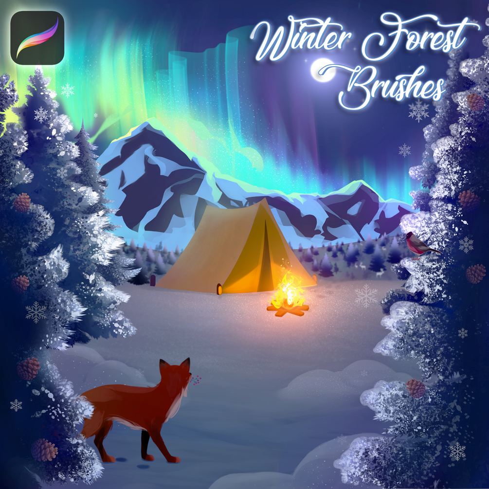 Make your drawing beautiful with these brushes! ❄️ There are 50 brushes in this set that will help you draw snow, icicles, winter trees, clouds, northern lights, stars, mountains, animals and much more. All brushes are made in high resolution. Brushes can be used for commercial purposes.