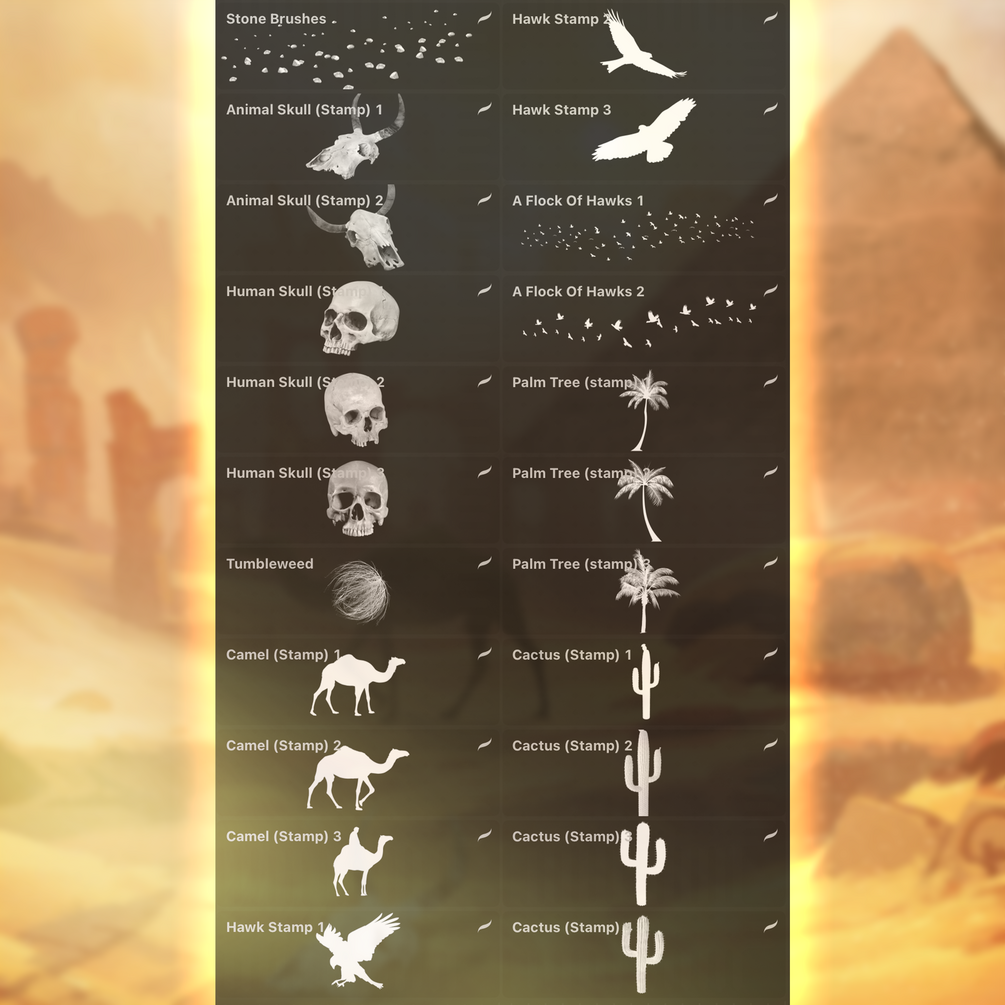 Make your drawing beautiful with these brushes! There are 44 brushes in this set that will help you draw the desert, Egyptian pyramids, hieroglyphs, sand, sand storm and much more🐪🌵