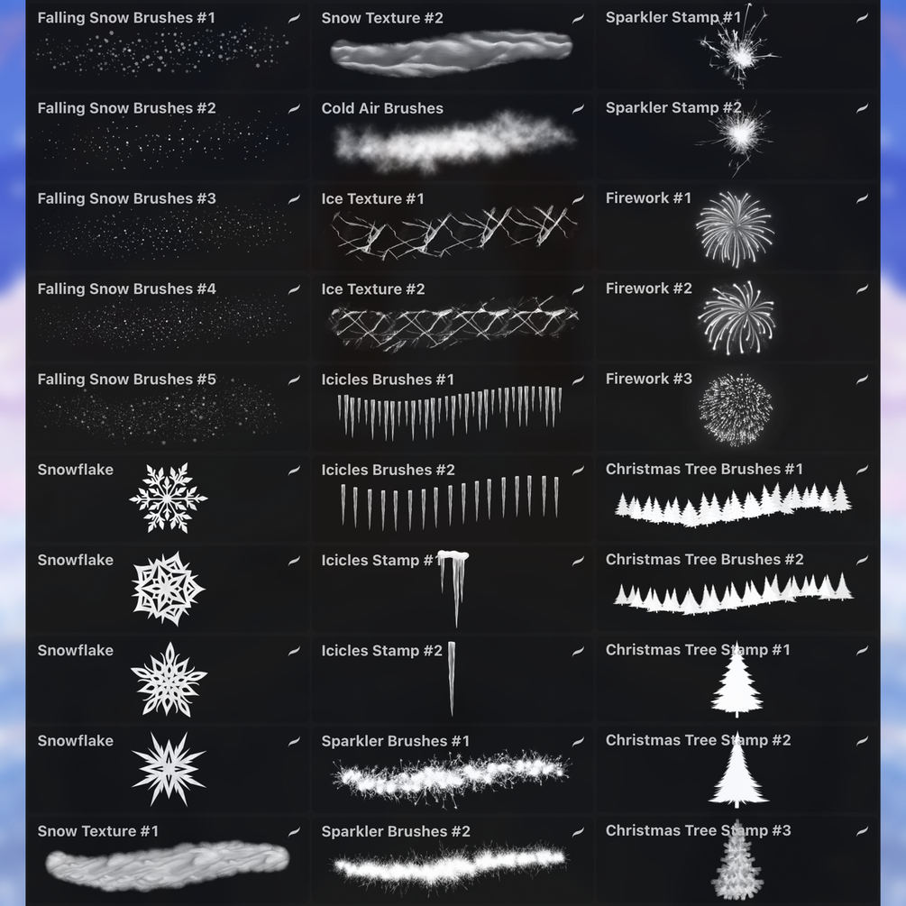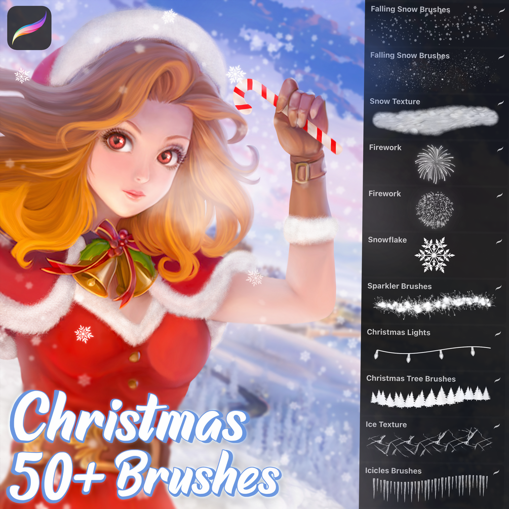 Make your drawing atmospheric with these brushes!❄️ This set has over 50 brushes to help you draw snow, sparklers, fireworks, gingerbread, garlands, and more. All brushes are made in high resolution. Brushes can be used for commercial purposes.