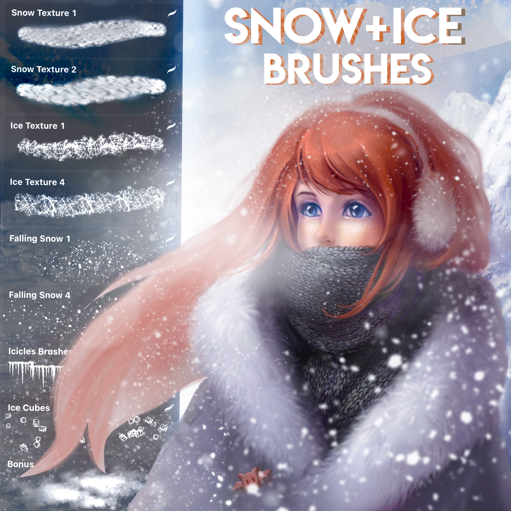 There are 32 brushes in this set. They will help you draw snow, ice, falling snow, ice cubes, snow texture, ice texture, and so on❄🧊