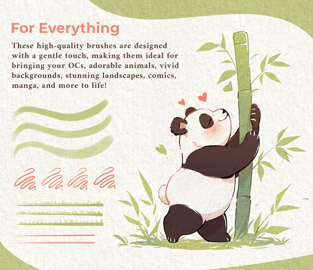Top it off with 5 premium paper textures to give your work that perfect final touch. Ideal for characters, animals, backgrounds, landscapes, manga, and comics — this set does it all!