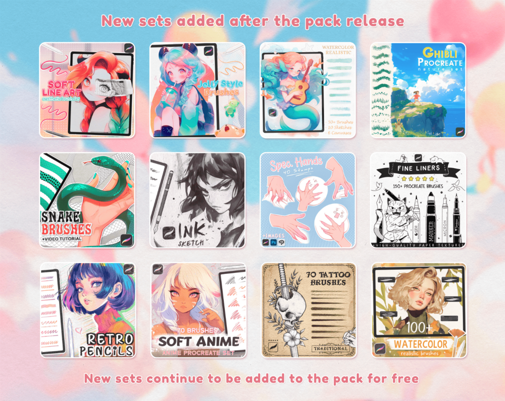 Hello! I've combined all my brush sets into one massive bundle – over 3000 brushes for Procreate. It includes every set available in my store. Explore each individual set within the bundle in my shop for full details. With this bundle, you save over $120 (do the math yourself). Upgrade your creative tools today!