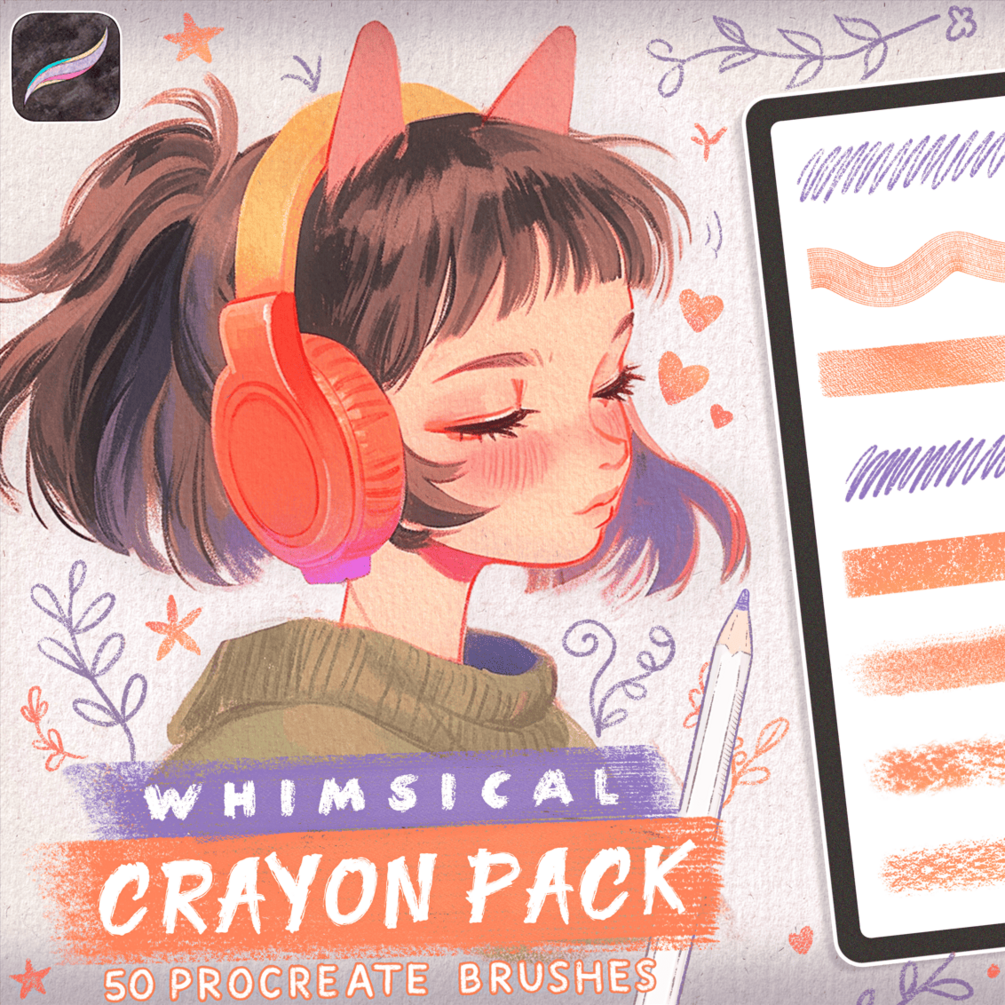 Whimsical Anime Crayon Brushes is a collection of 50 hand-crafted procreate brushes made to add warmth, softness, and texture to your digital artwork. Inside you’ll find gentle chalk brushes for sketching and line art, textured tools for shading and depth, fine brushes for delicate details, and even a paper texture brush to give your work a classic, traditional feel.