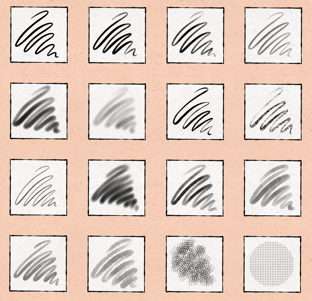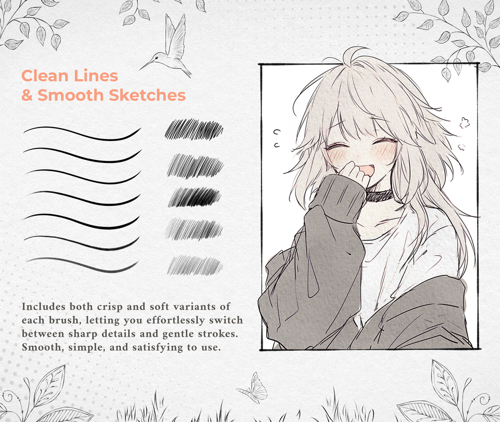 Made for any artistic style, this diverse set of 20 brushes offers everything you need: Soft Sketch and Smooth Line Brushes, Rich Marker Brushes, Gentle Skin and Coloring Brushes, Elegant Ink and Watercolor Brushes, Blenders, and unique Halftone & Tartan Textures. Perfect for both beginners and seasoned artists.