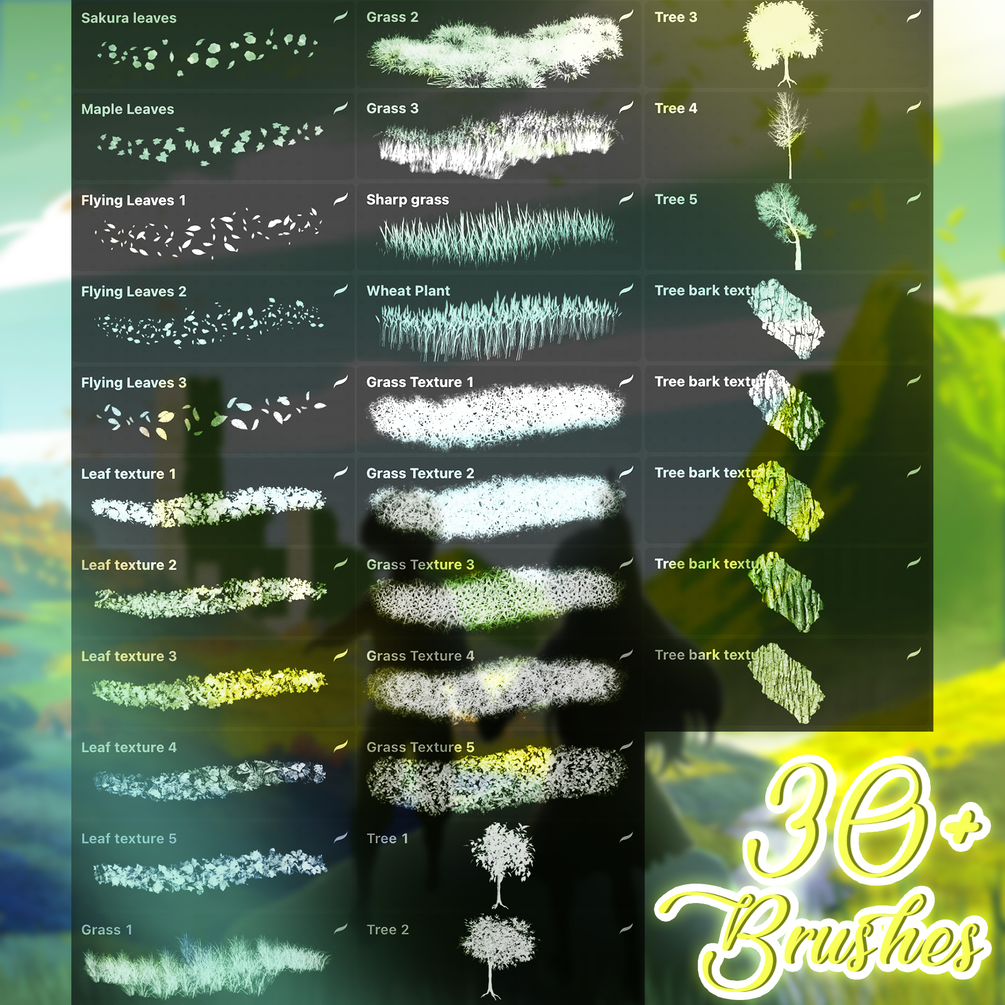 There are 30 plants brushes in this complete set. They will help you draw beautiful sakura foliage, maple foliage, grass, trees, tree bark texture, and so on🌿🌳
