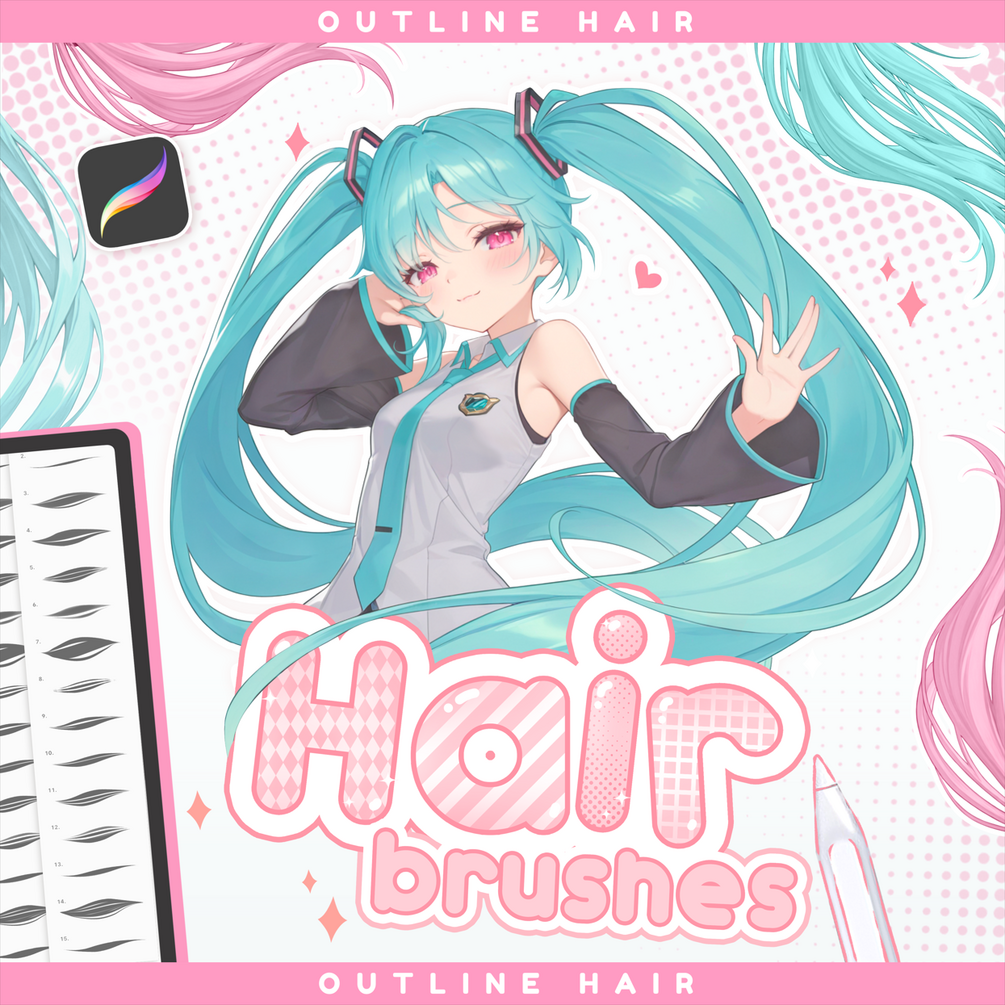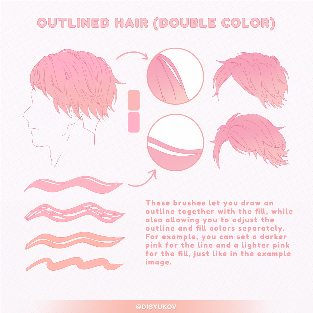 - Outline Hair (Double Color) – 6 brushes (customizable line and fill colors)