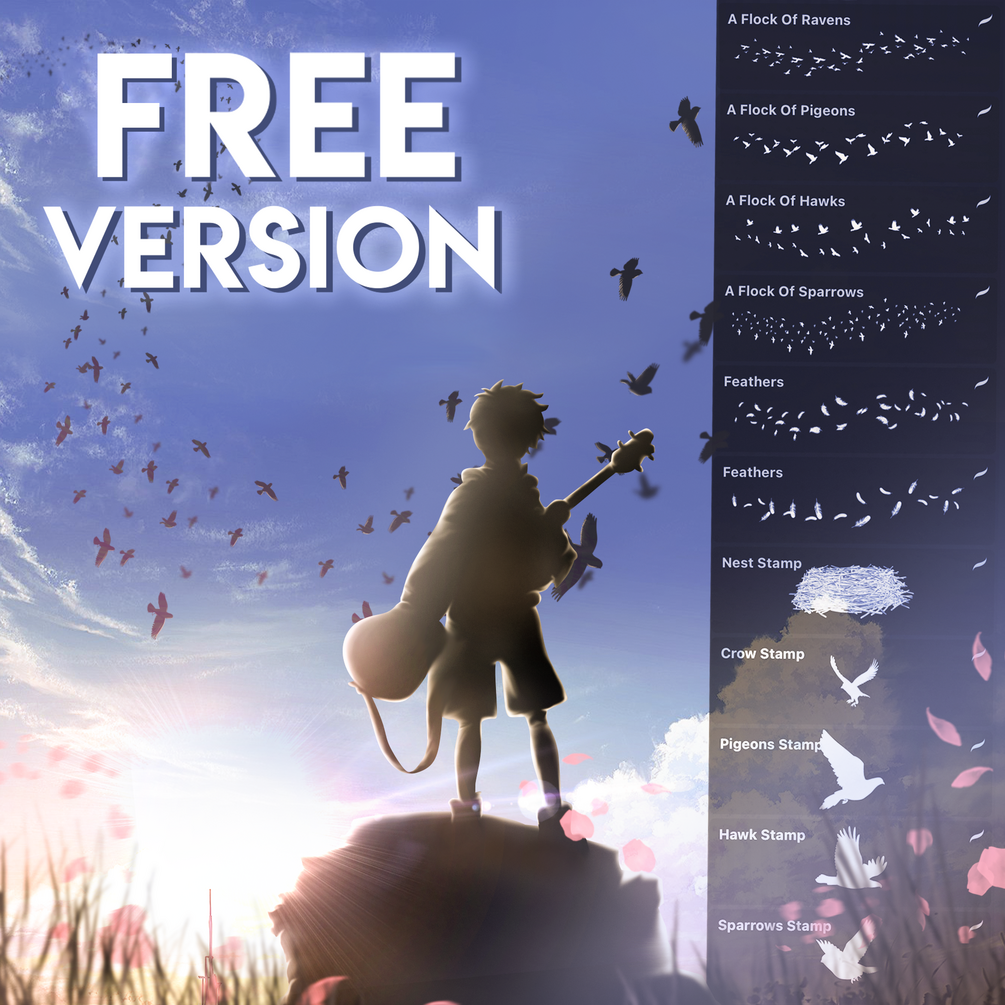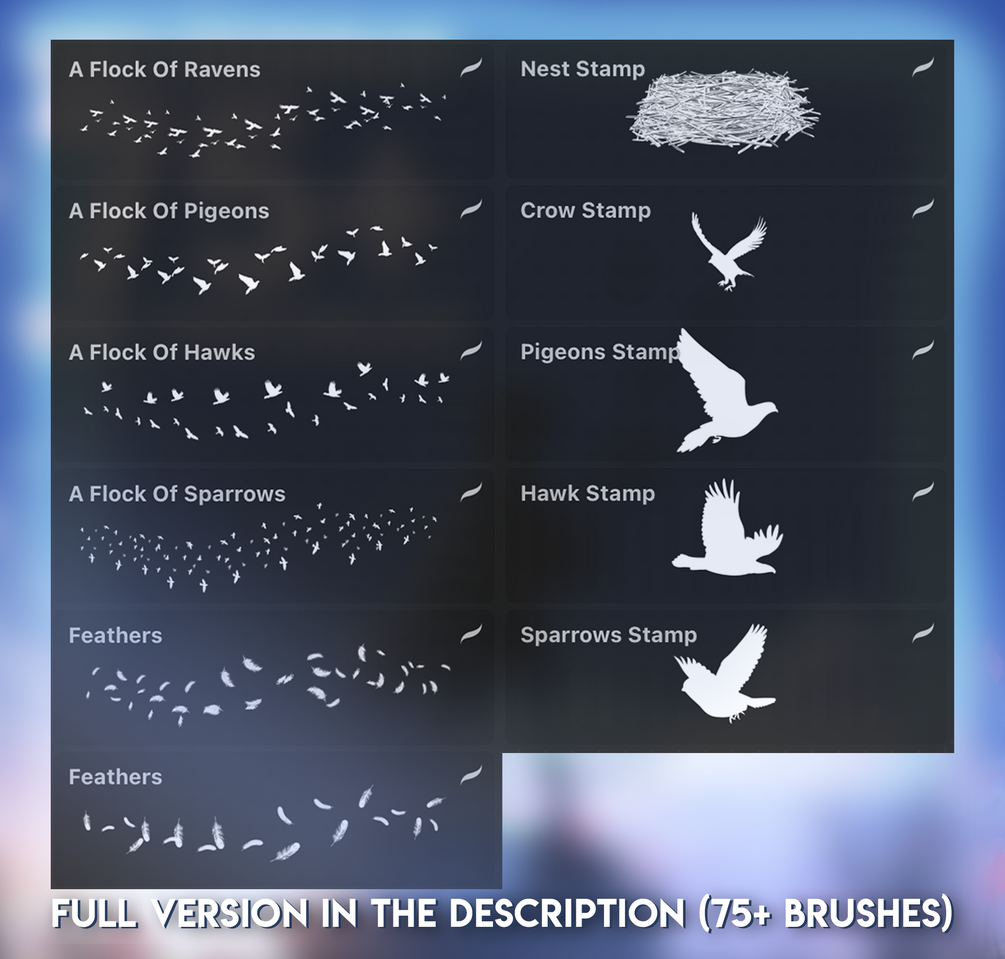 There are 11 brushes in this free set. They will help you draw several types of birds, feathers, nests, and so onš£