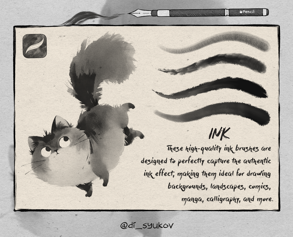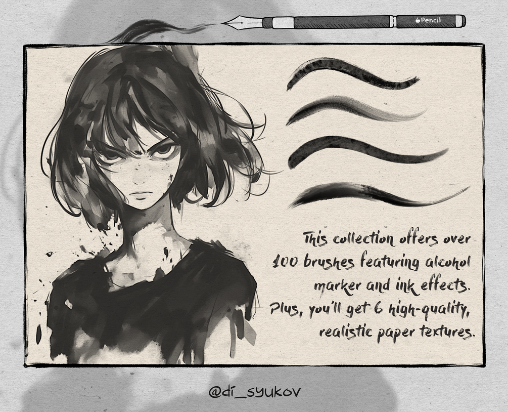 Unleash your creativity with the "Ink Brushes for Procreate" – a versatile set designed for digital artists of all levels. Whether you're a beginner or a seasoned professional, this collection offers everything you need, from alcohol markers and real ink brushes to six paper textures, splatter brushes, sketch pencils, and pens. Perfect for creating backgrounds, illustrating comics or manga, or refining calligraphy, these brushes provide limitless opportunities.
