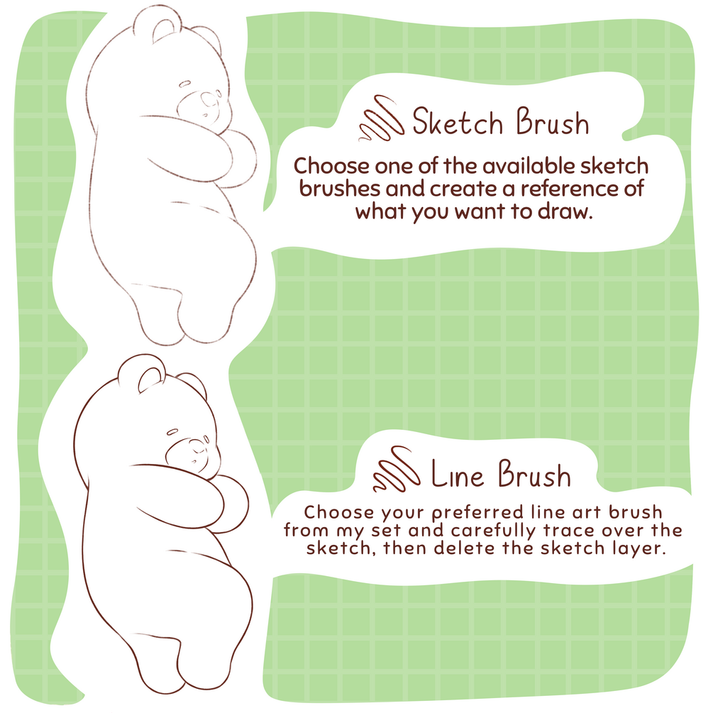Choose your preferred line art brush from my set and carefully trace over the sketch, then delete the sketch layer.