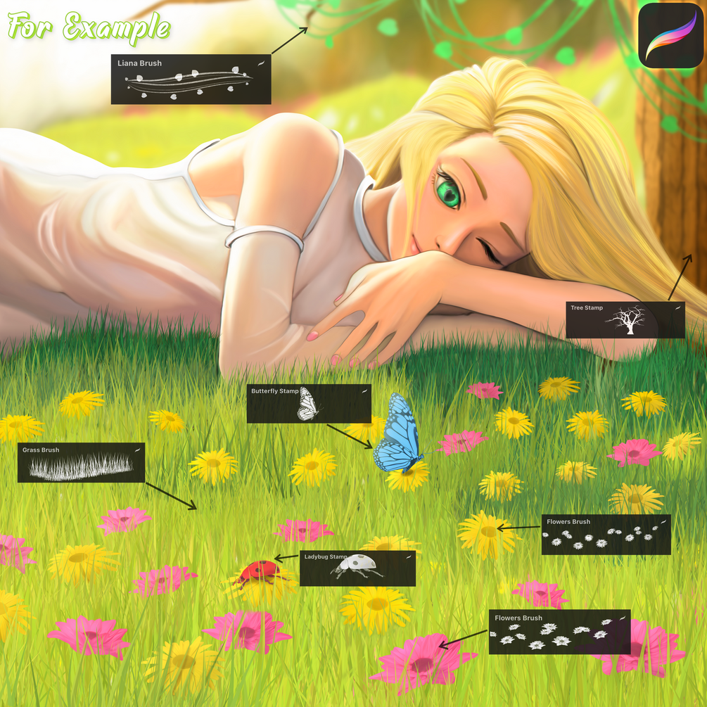 Make your drawing atmospheric and beautiful with these brushes! This set has many unusual brushes that you won't find anywhere else. These brushes will help you draw different kinds of lianas, foliage, flowers, insects, and more.