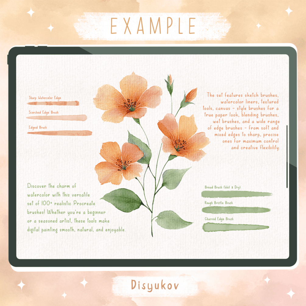 Dive into the world of watercolor with this exclusive set of 100+ realistic watercolor brushes for Procreate! Perfect for both beginners and professionals, the brushes let you paint with ease while keeping the authentic feel of watercolor.